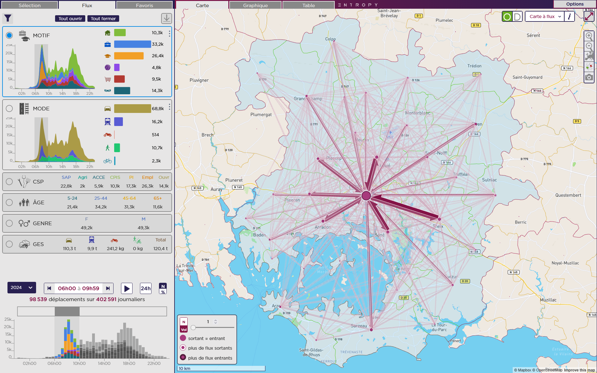 Accédez à une plateforme complète de visualisation et d’analyse des mobilités : origines-destinations, volumes journaliers ou par demi-heure, modes de transport, motifs de déplacement, bilan carbone